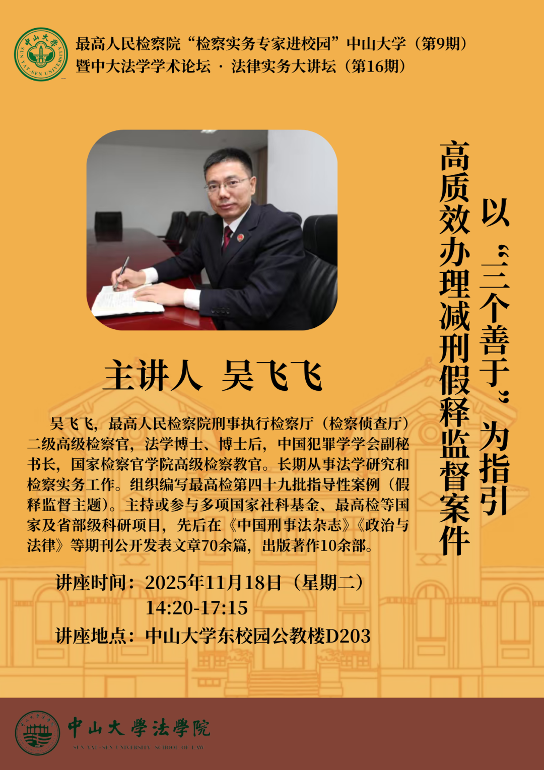 最高人民检察院“检察实务专家进校园”www.betvlctor1946.com(第9期)、中大法学学术论坛·法律实务大讲坛(第16期):以“三个善于”为指引高质效办理减刑假释监督案件