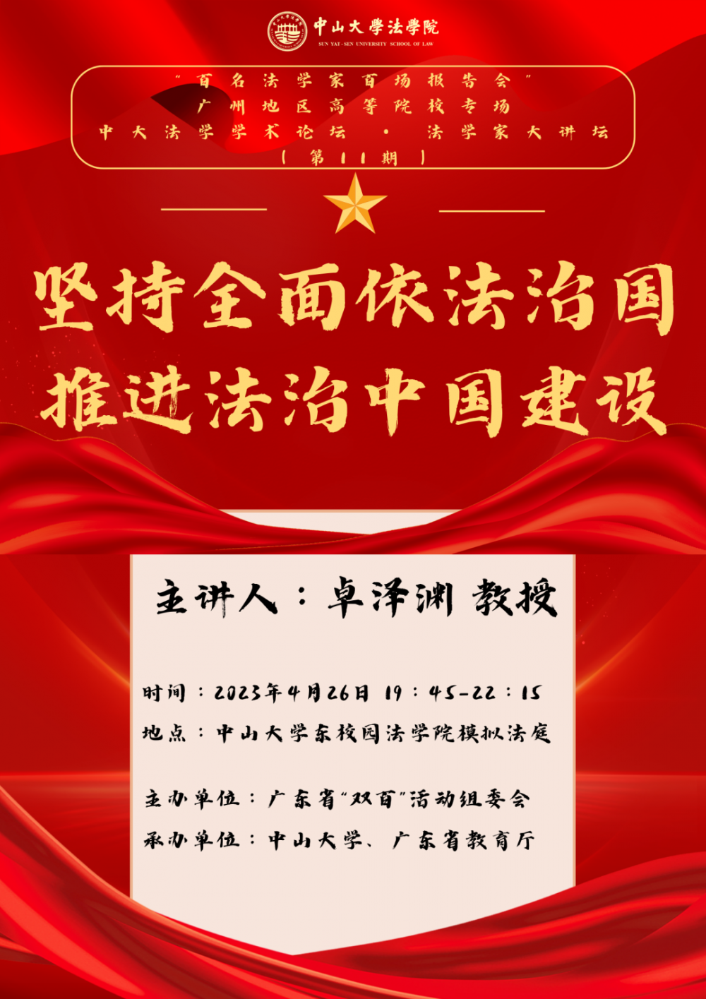 【学术论坛预告】“百名法学家百场报告会”广州地区高等院校专场、中大法学学术论坛 • 法学家大讲坛(第11期)——坚持全面依法治国 推进法治中国建设